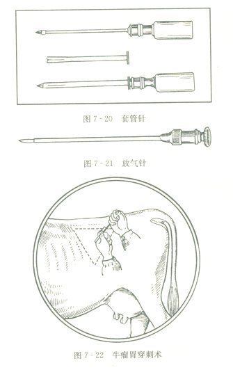 (1) 穿刺放气:在左肷部 ( 髋节结 ) 中点与最后肋拍带骨水平线的中点隆起最高处,剪毛、消毒,用盐水放气针或套管针刺入瘤胃放气 ( 图 7 一 20 、图 7 一 21 、图 7—22 、图 7—23) 。