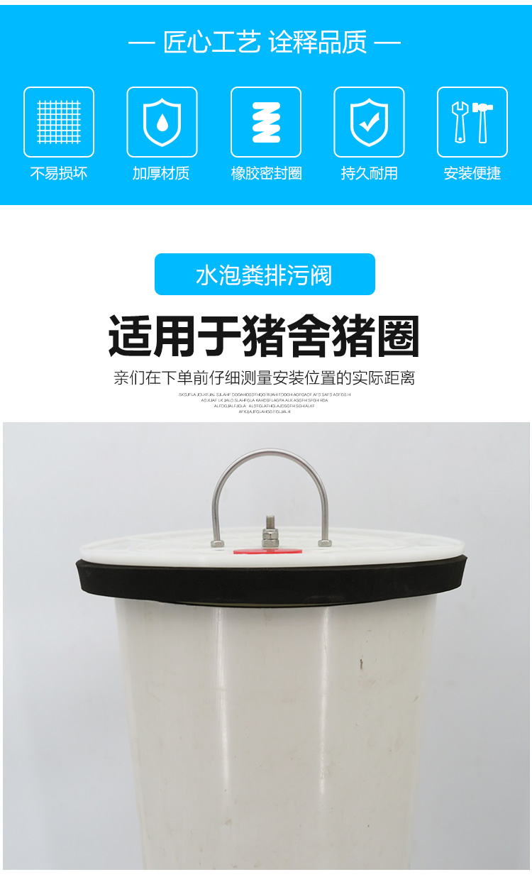 雅江水泡粪猪场排污阀养殖排污阀地沟塞养殖场畜禽粪便污水处理采用一体化污水处理设备,这种设备对于养殖污水处理可以达到很好的效果,养殖污水处理设备更能合理的处理禽畜粪便。养殖场的禽畜粪便的处理一直是令养殖场非常头疼和棘手的麻烦事。虽然从一个角度看,粪便的资源化利用是个很不错的主意,但是在实践中,难度也很大。虽然沼气发酵是能实现资源化利用的一个途径,但是对养猪场来讲,沼气发电不是他们的主业,而且为了处理这些粪便所需要投入的沼气池建设费、发电设备、沼气提纯设备、沼气液化设备及转运设备等等,其投资总和似乎已经远远超过养猪场的投入成本。如果采用简易的沼气池技术,那种在池子上盖橡胶罩的方式,似乎有好几个放在身边,让业主放心不下。本身养猪就是一个冒风险的事业,强行搭配一个沼气设备的管理,又多出一个风险点,生出很多枝节,普遍为养殖场业主犹豫,总希望有一个简单而又实用的技术,能够让养殖场既能通过环保验收,又不要耗费太大的投资。从这个角度出发,我公司科研人员通过对比试验,总结别人的经验,探索自己的方法,逐渐完善养殖场的粪便处理方案。经过不懈的努力,我们基本形成自己独特的模式,希望通过本文的介绍,能给养殖户带来启发。水泡粪工艺是把双刃剑,用的好就有益,用不好弊大于利